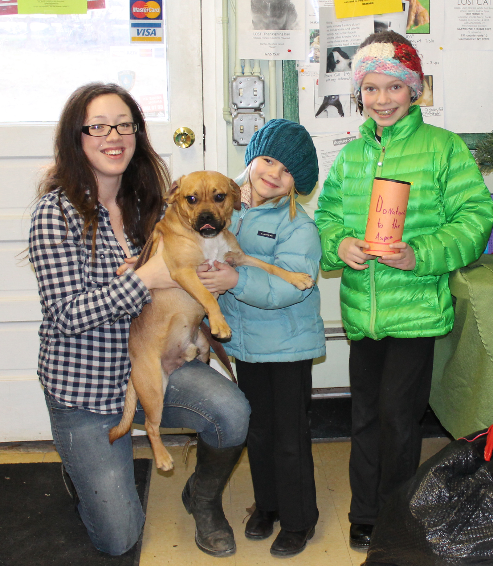In an act of humanitarian kindness, Althea and Eudora Brennan of Ghent, NY held a yard sale and collected $30.58 for the benefit of the sheltered animals at the Columbia-Greene Humane Society/SPCA in Hudson. Pictured, the two young ladies are being thanked by CGHS/SPCA Adoption Counselor Jhori Jurgenson and Sausages, an enthusiastic 1-year old male “Puggle” (Beagle/Pug cross).